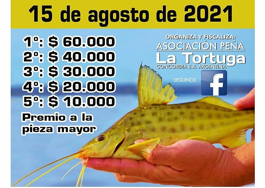 El próximo 15 de agosto de 2021 se realizará XXVII Torneo Argentino Pesca del Amarillo en la ciudad de Concordia, organizado y Fiscalizado por la Asociación Peña La Tortuga. El valor de la inscripción será de 6.000 pesos . Hasta el 13 de agosto se inscribirá en Monseñor Tavella 1314 Armería el Viracho – Luego el sábado 14 y domingo 15 de Agosto, se estará inscribiendo en el predio de la Asociación Peña La Tortuga. Por más informes Tel.345-405-8865 / 3454 285 338 / 1169961979.